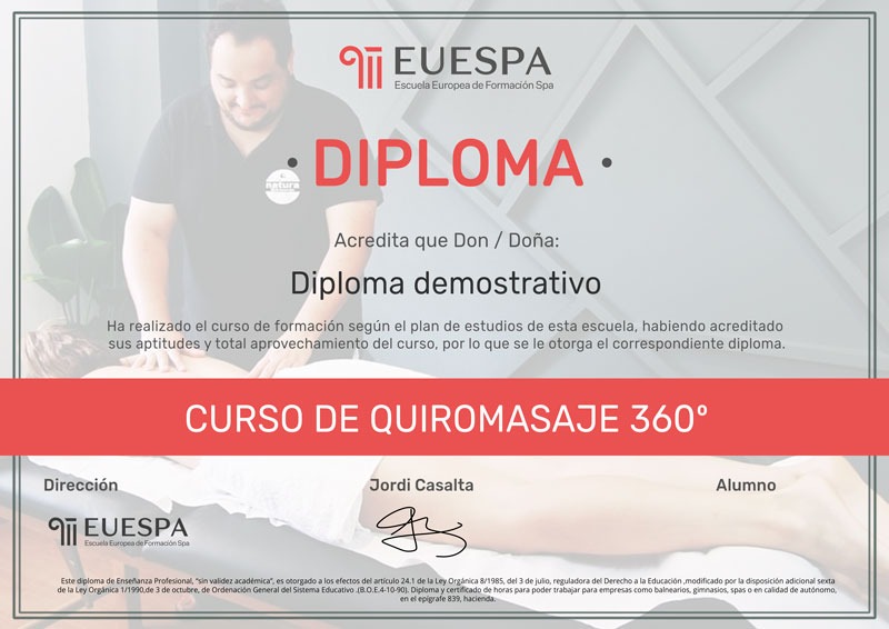Con nuestro diploma EUESPA podrás trabajar en centros de masaje, gimnasios, hoteles, balnearios, centros de estética, o en tu propio centro de masaje, ya que se trata de una profesión con gran demanda y reconocida por el Ministerio de Trabajo.